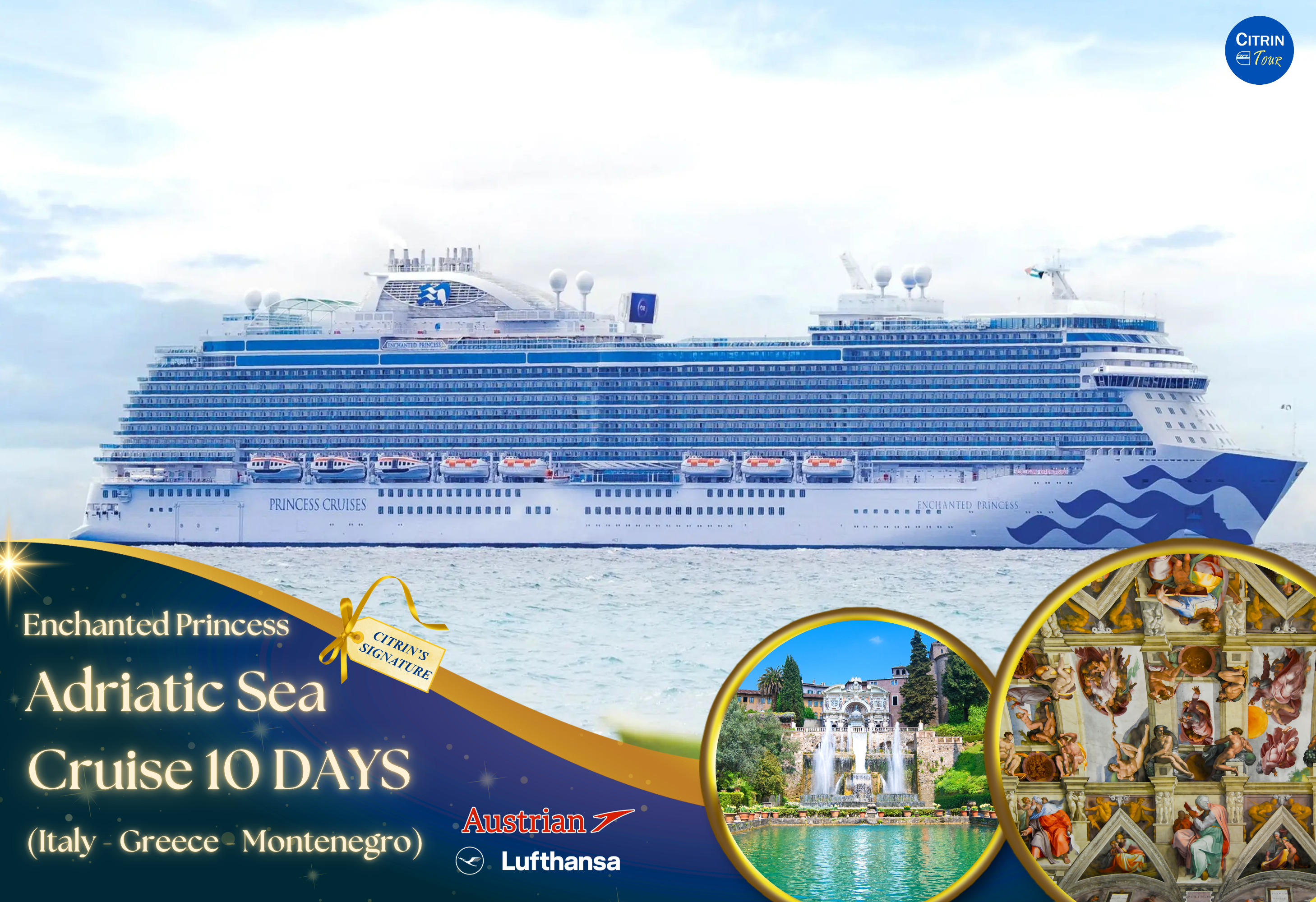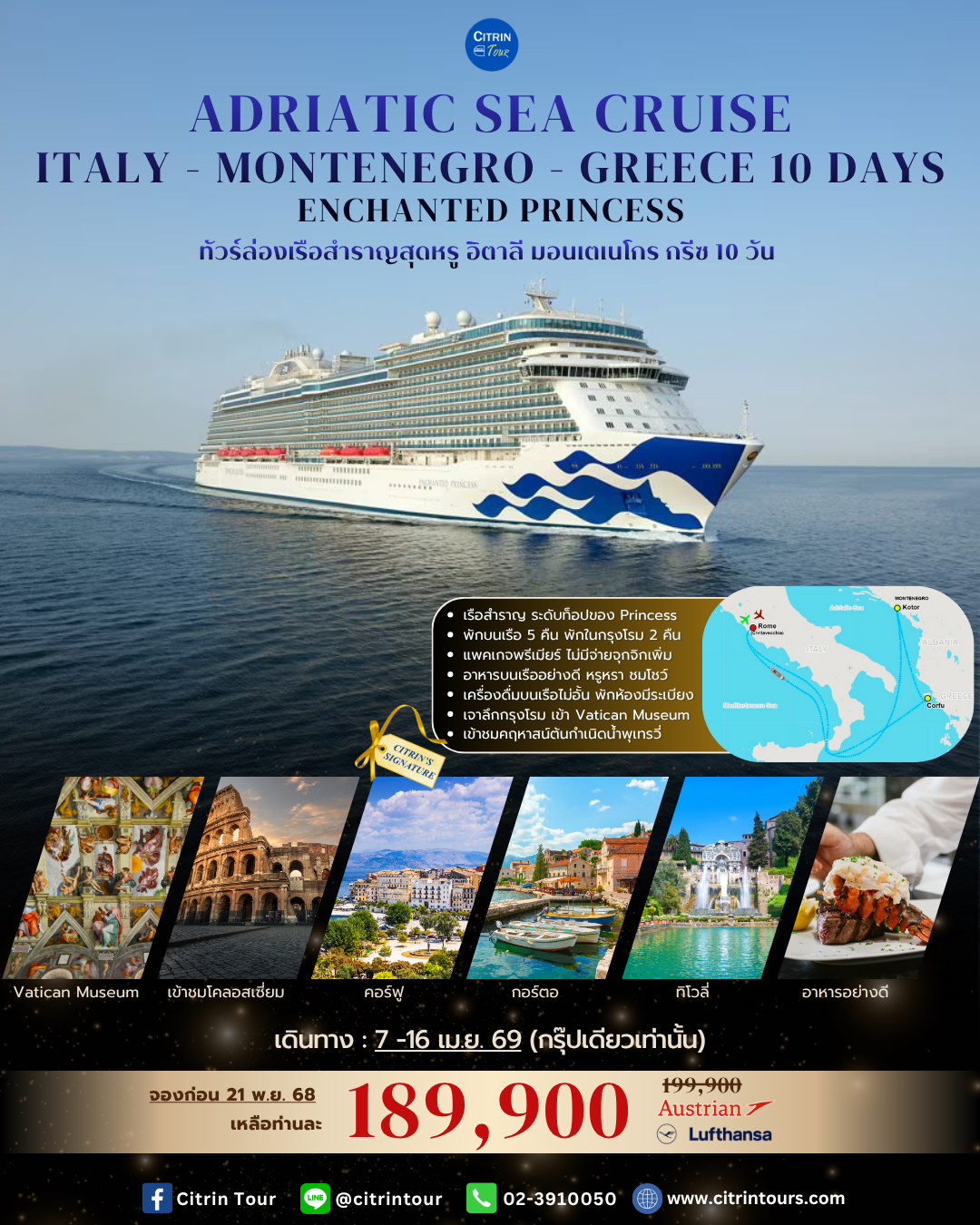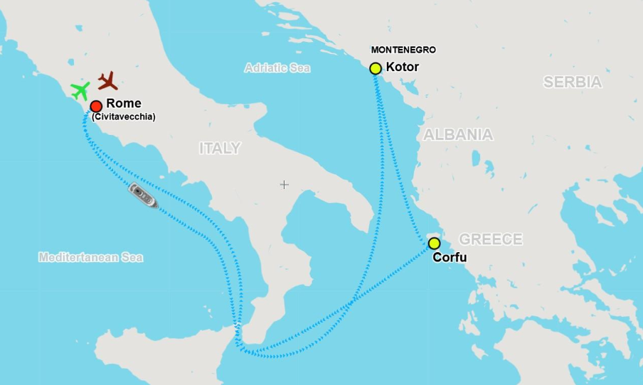 โรม - เข้าชมพิพิธภัณฑ์วาติกัน - วิหารน้อยซีสทีน ห้องประชุมแต่งตั้งพระสันตะปาปา - น้ำพุเทรวี่ - เข้าชมโคลอสเซียม - ชอปปิ้ง - บันไดสเปน - วิหารพานเธออน - กอตอร์ มอนเตรเนโกร - คอร์ฟู กรีซ - ขึ้นฝั่งโรม - ทิโวลี่ - วิลล่า ดิ เอสเต้