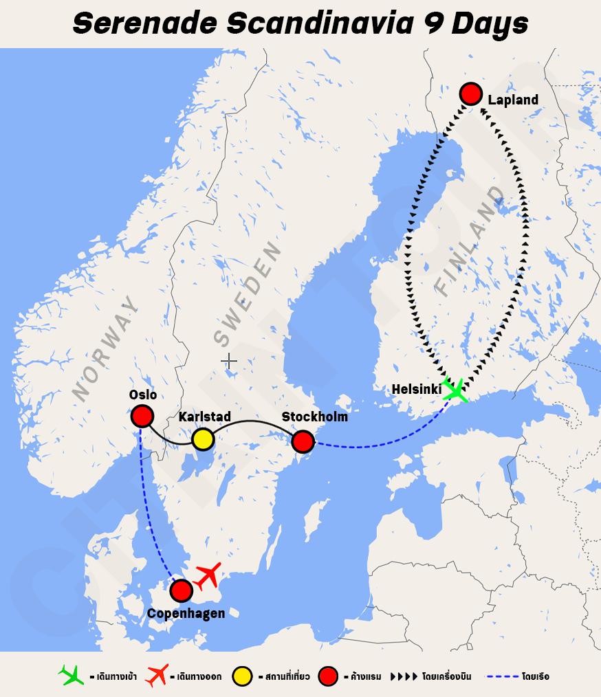 เฮลซิงกิ - โบสถ์หิน - โรวาเนมิ - บ้านซานตาคลอส - สโนวโมบิล - รถเลื่อนกวางเรนเดียร์ - ข้ามเส้นขั้วโลกเหนือ - แสงเหนือออโรร่า - สต็อคโฮลม์ - ซิตี้ฮอลล - ห้องจัดเลี้ยงรางวัลโนเบล - เรือรบวาซา - ออสโล - พระราชวังหลวง - สวนปฏิมากรรมวิกเกลแลนด์ - เรือไวกิ้ง - เรือสำราญ SILJA LINE และ DFDS - โคเปนเฮเกน - เงือกน้อย - น้ำพุเกฟฟอน - พระราชวังหลวง - ย่านท่าเรือใหม่ - ถนนสโตรเกท